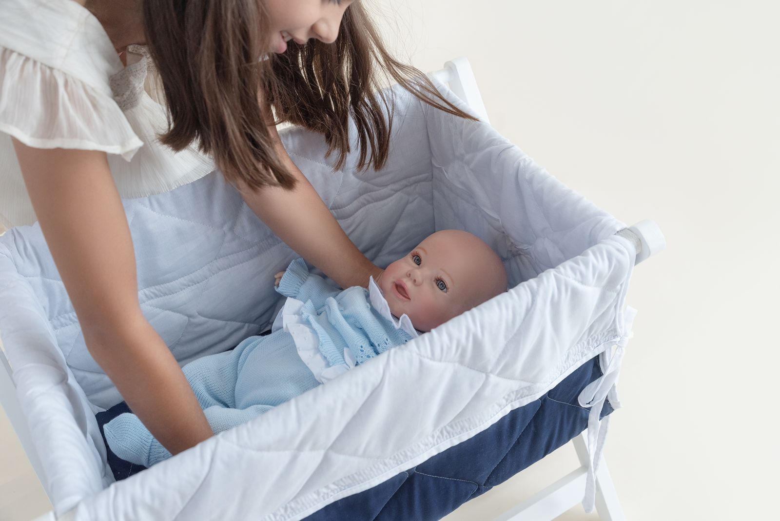 Hermosa cunita de juguete de tela y base de madera plegable.