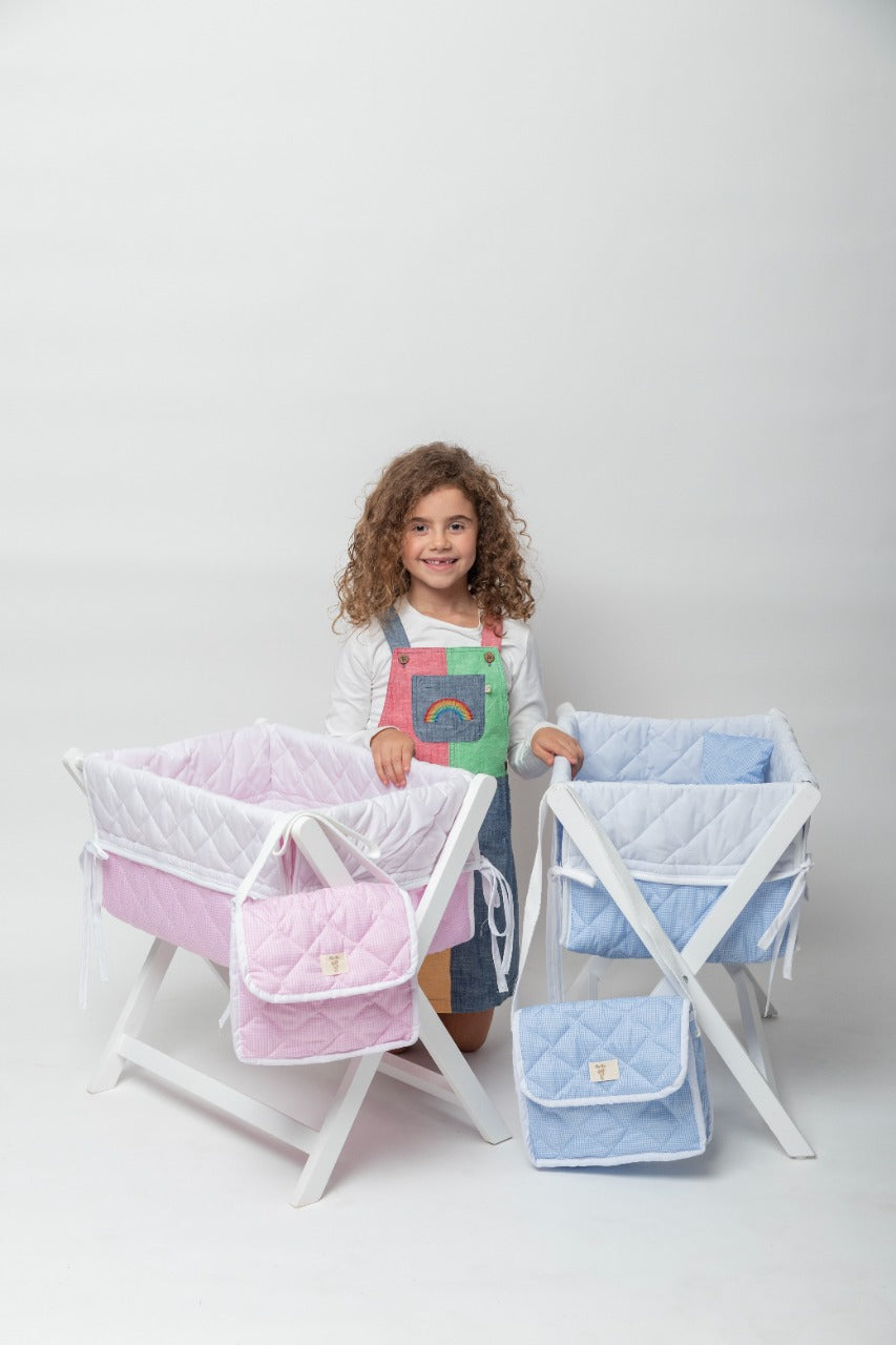 Hermosa cunita de juguete de tela y base de madera plegable.