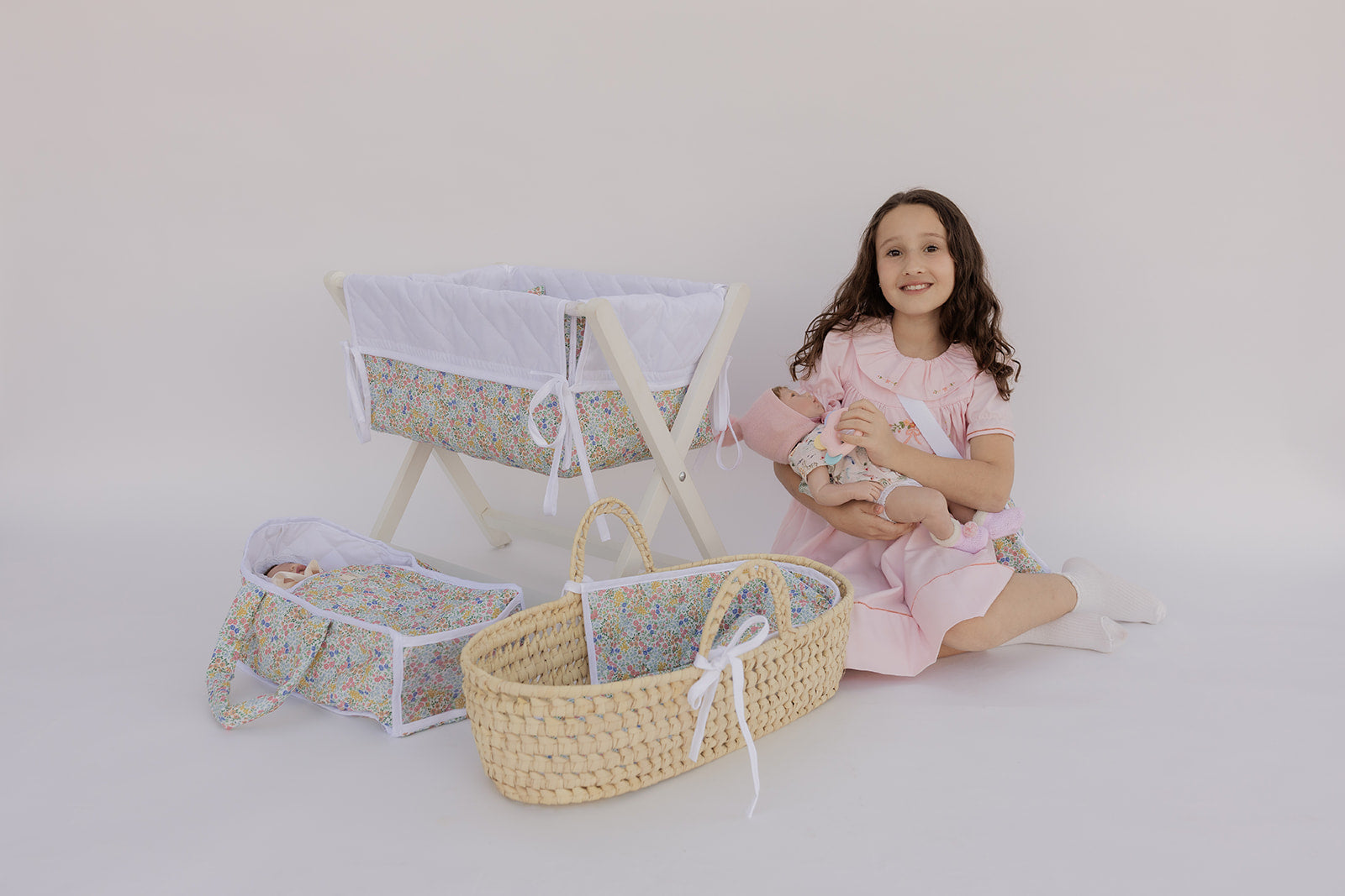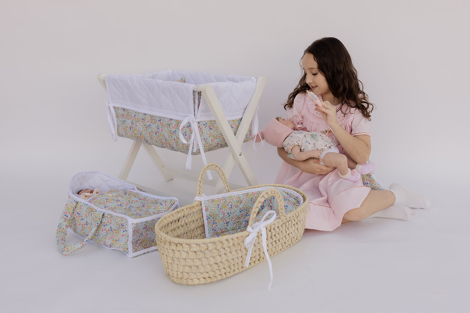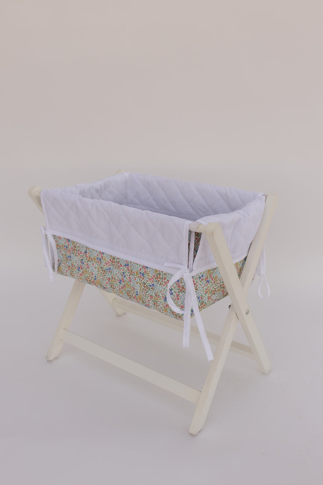 Hermosa cunita de juguete de tela y base de madera plegable.