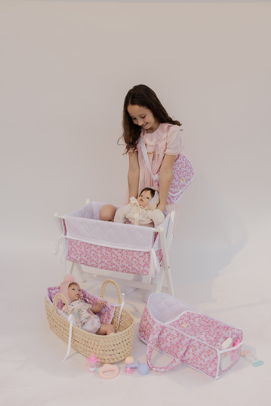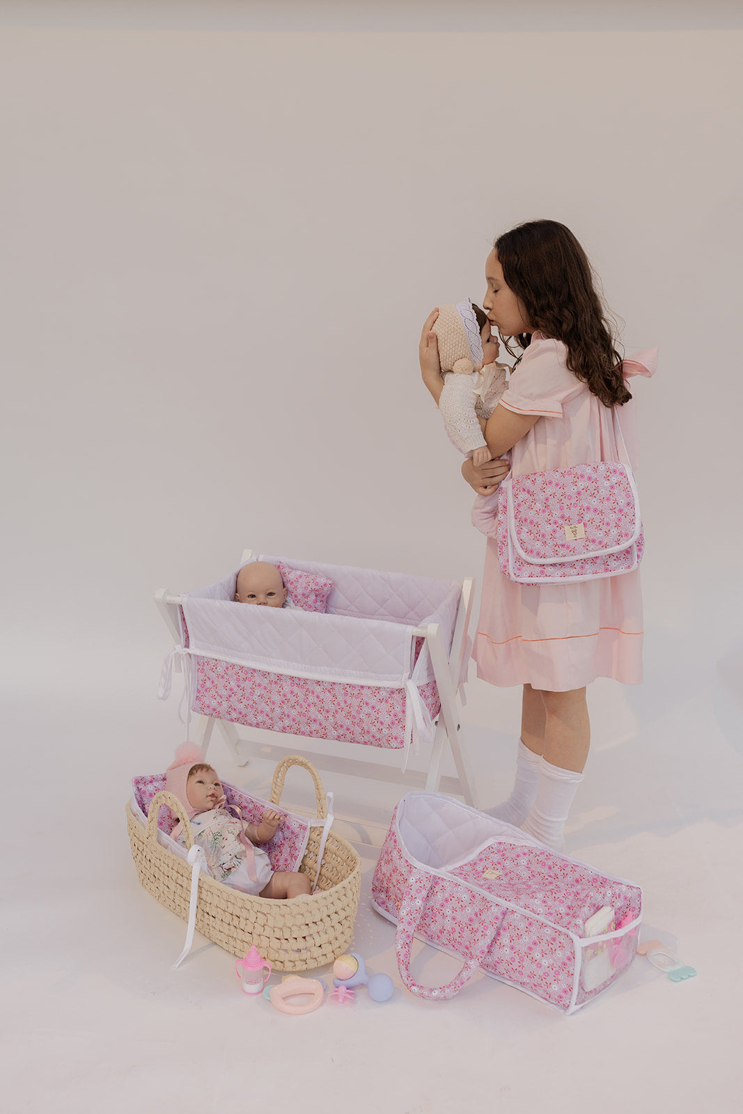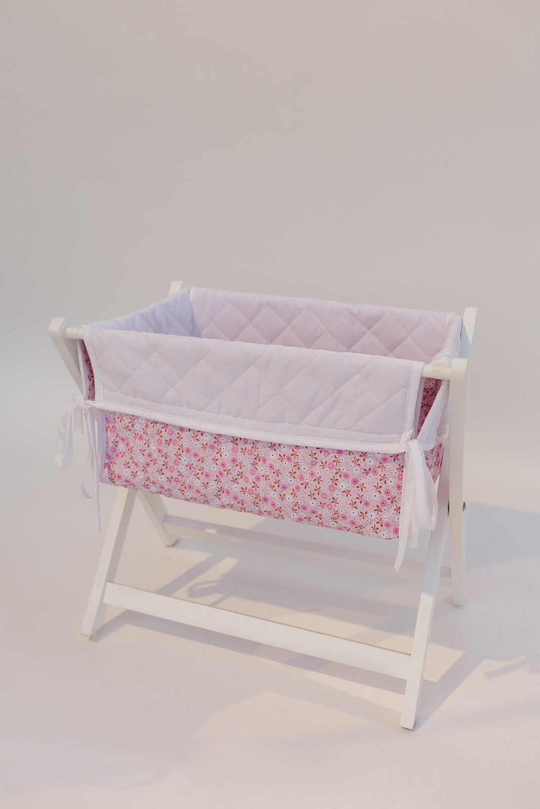 Hermosa cunita de juguete de tela y base de madera plegable.