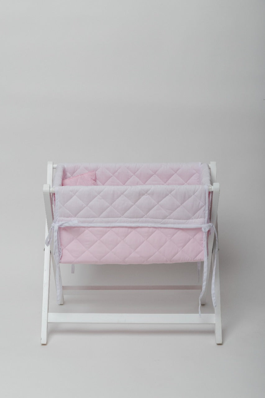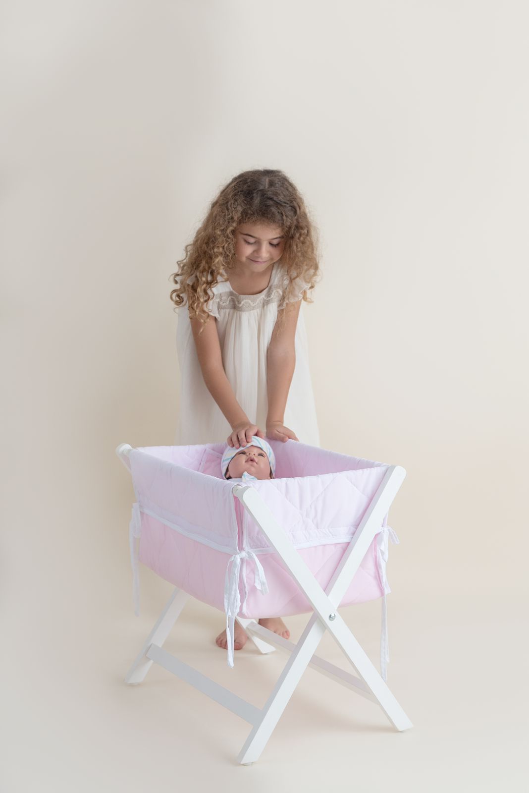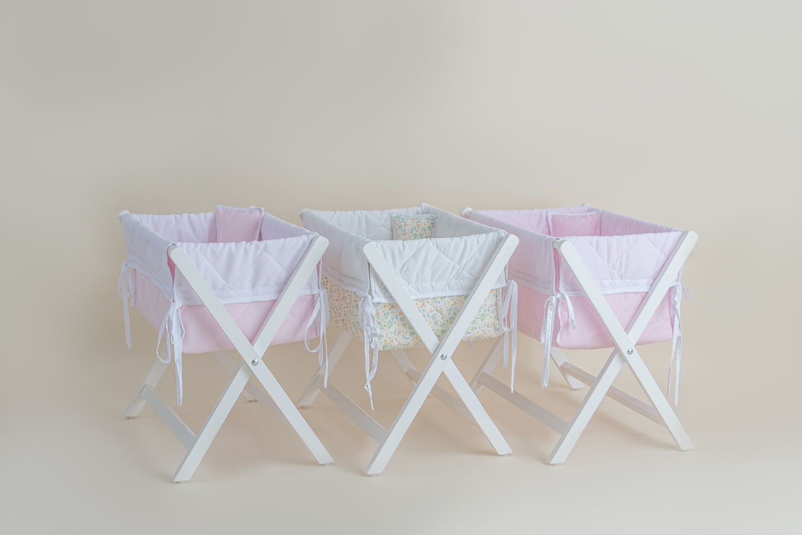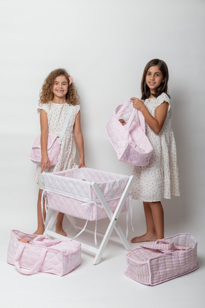 Hermosa cunita de juguete de tela y base de madera plegable.