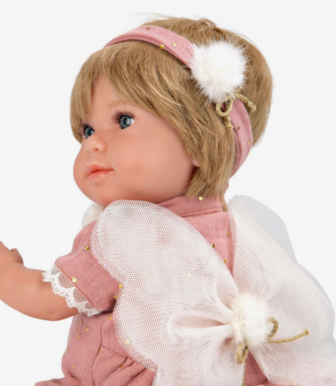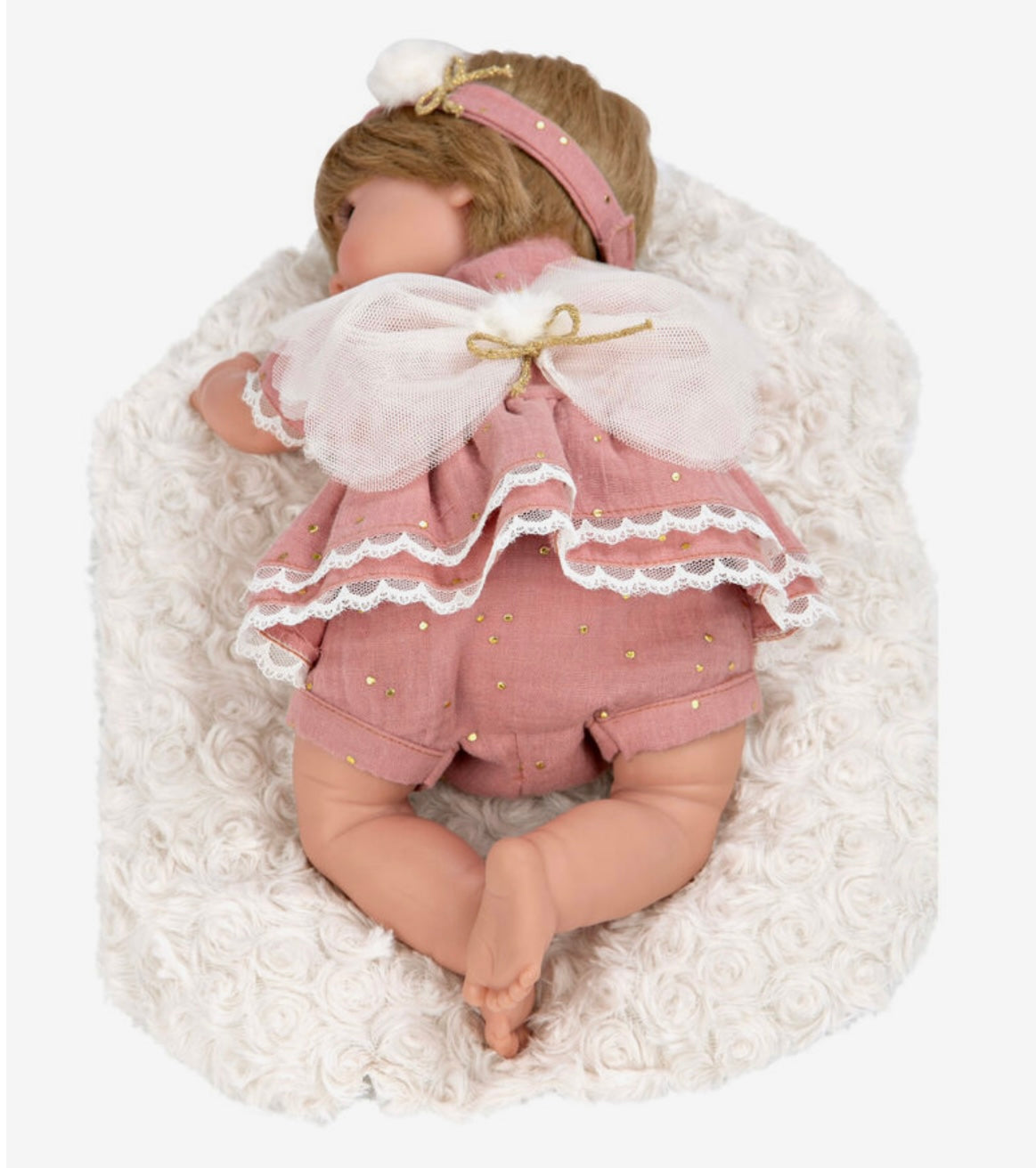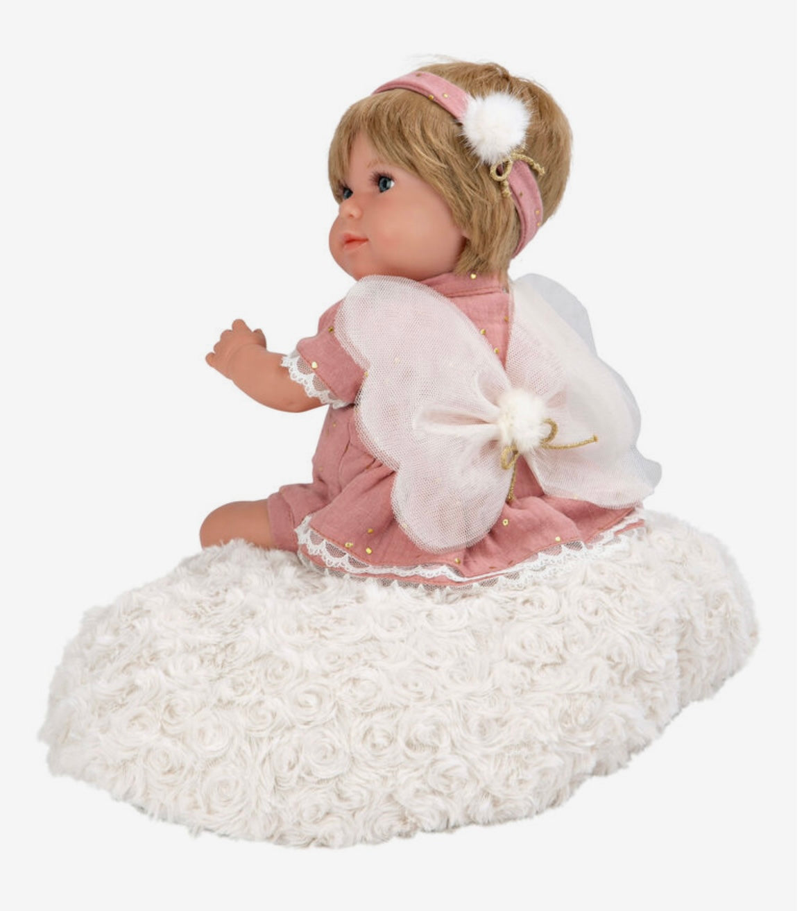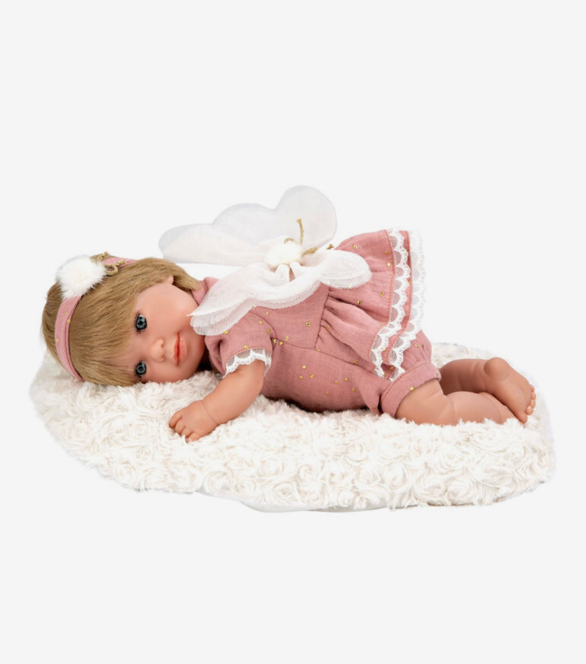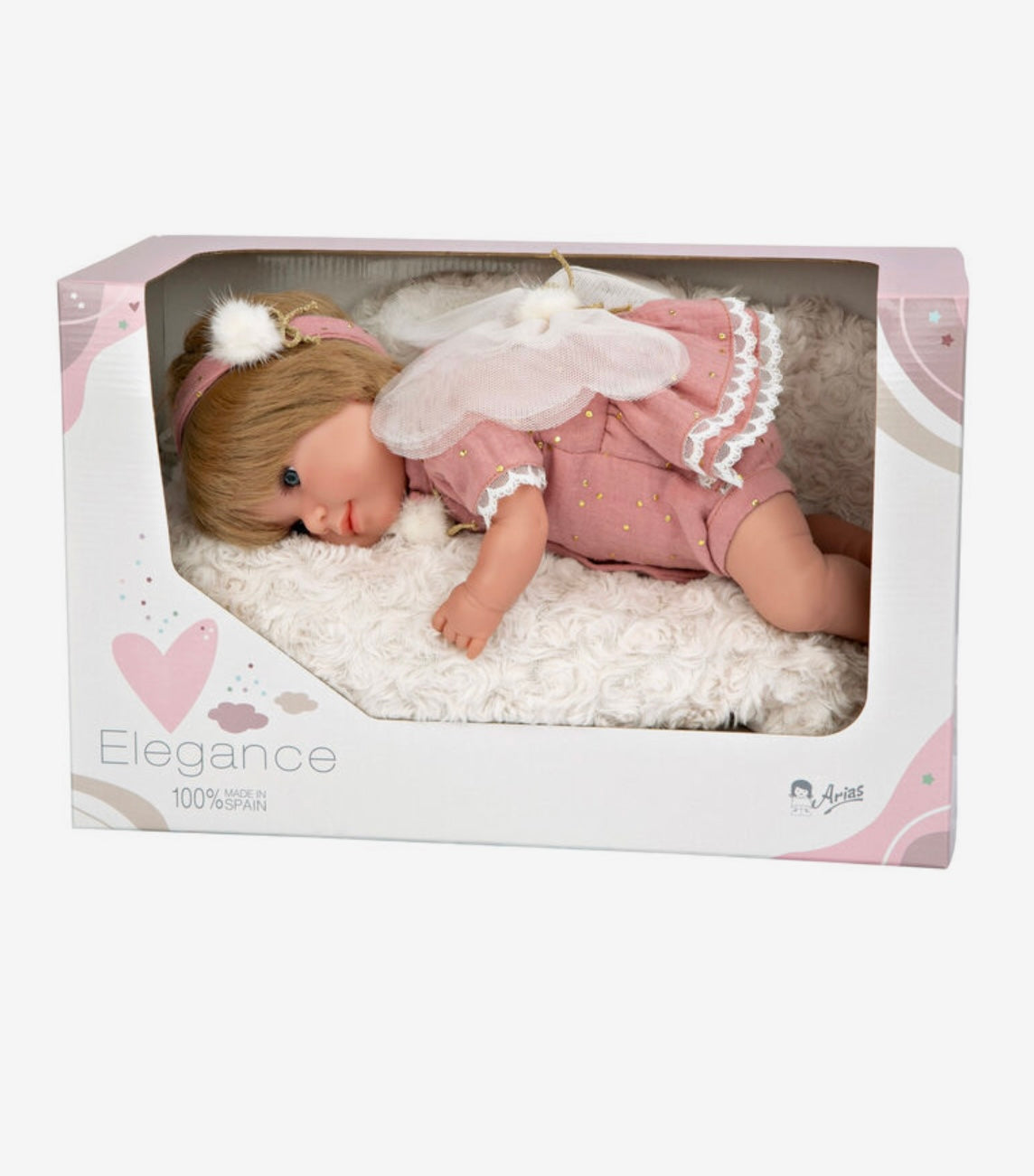 Arias Muñeca Elegance Mariposa; Con cuerpo blando y extremidades de vinyl, a la que se ha vestido en tonos rosa maquillaje e incorporado unas alas de mariposa. Incluye cojín y chupete.