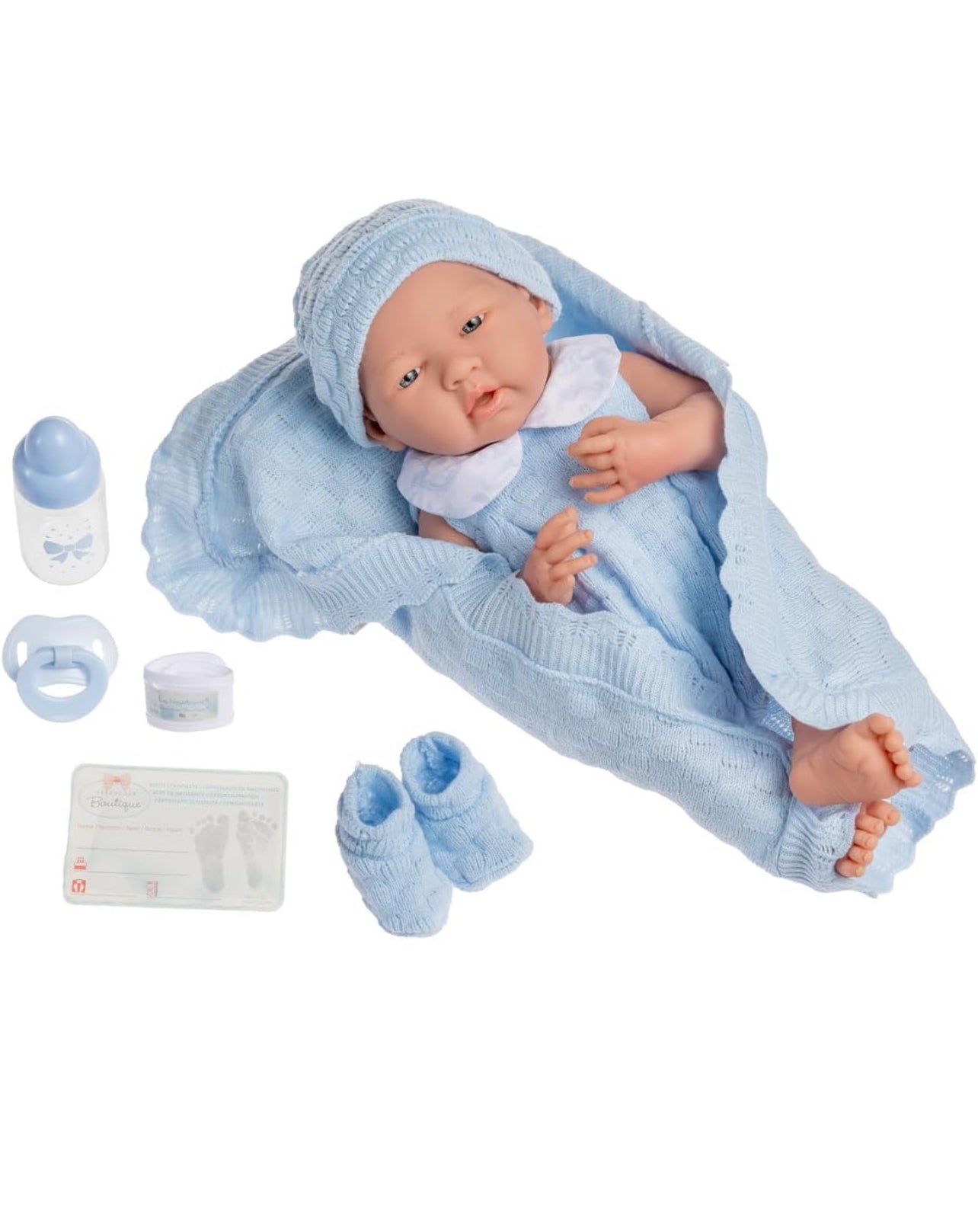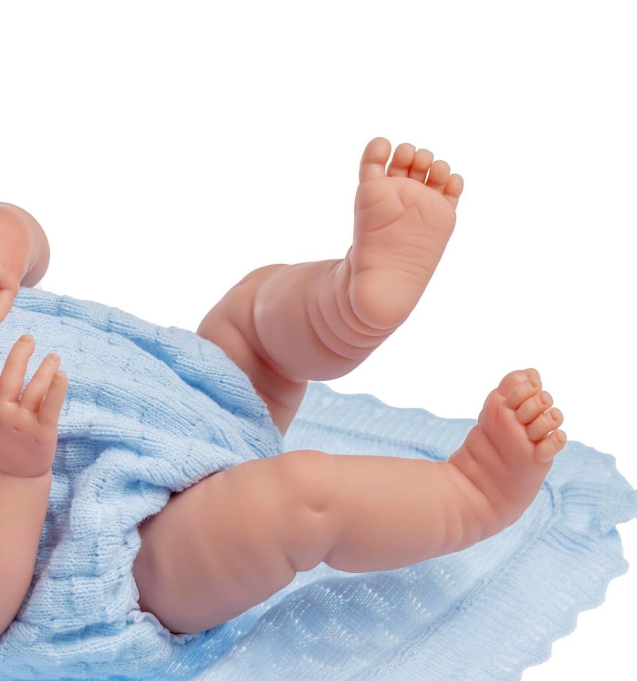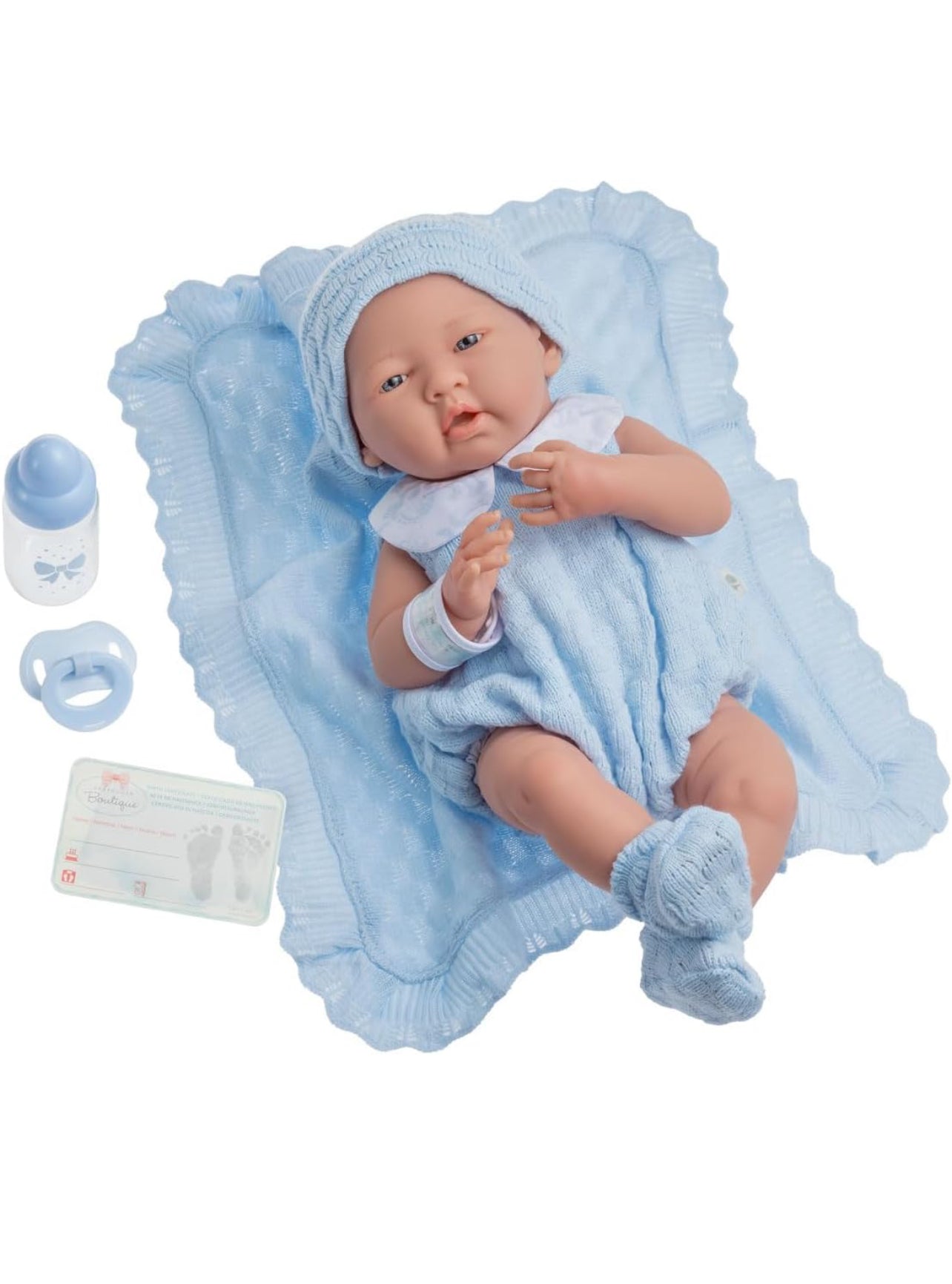 Si estás buscando una muñeca de bebé anatómicamente correcta que capte la experiencia única en la vida de traer a casa un bebé nuevo, entonces esta La Newborn es la muñeca perfecta para ti. Fabricado en España para niños de 2 años o más. Vestida con un bonito conjunto de punto, nuestra recién nacido es tan dulce como puede ser. Esta preciosa La Newborn cuenta con una expresión deliciosa y llamativos ojos azules que seguramente derretirán tu corazón. Es un "Real Boy" de 15" de vinilo anatómicamente correcto con brazos, piernas y cabeza movibles. Está hecho completamente de vinilo para un fácil cuidado.